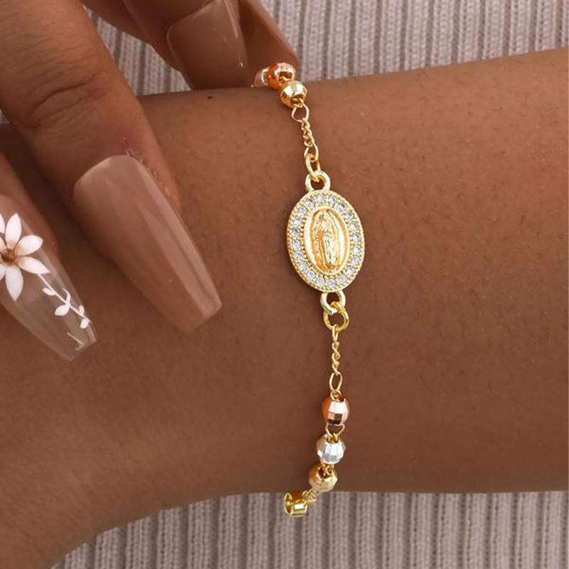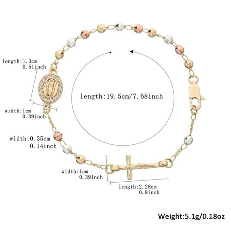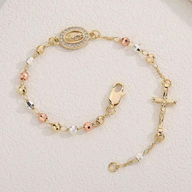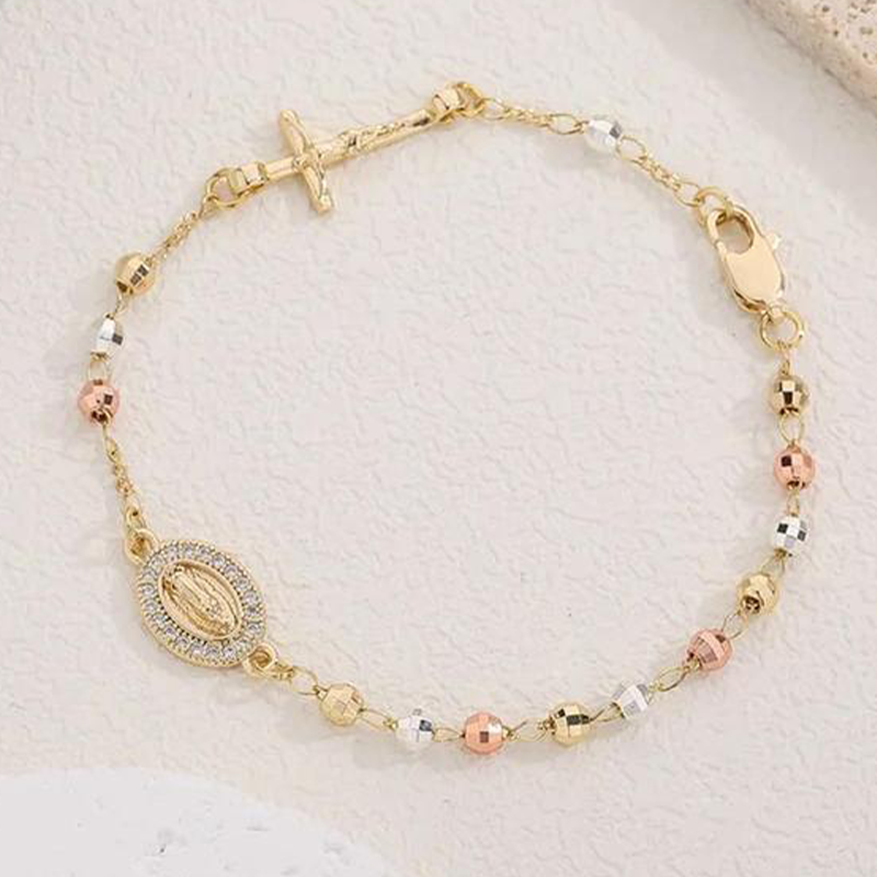 CHARMES SYMBOLIQUES COMPLEXES - Orné d'une croix détaillée et d'un médaillon étincelant incrusté de strass, ce bracelet est une expression gracieuse de la foi et ajoute une touche sophistiquée et significative à votre style.