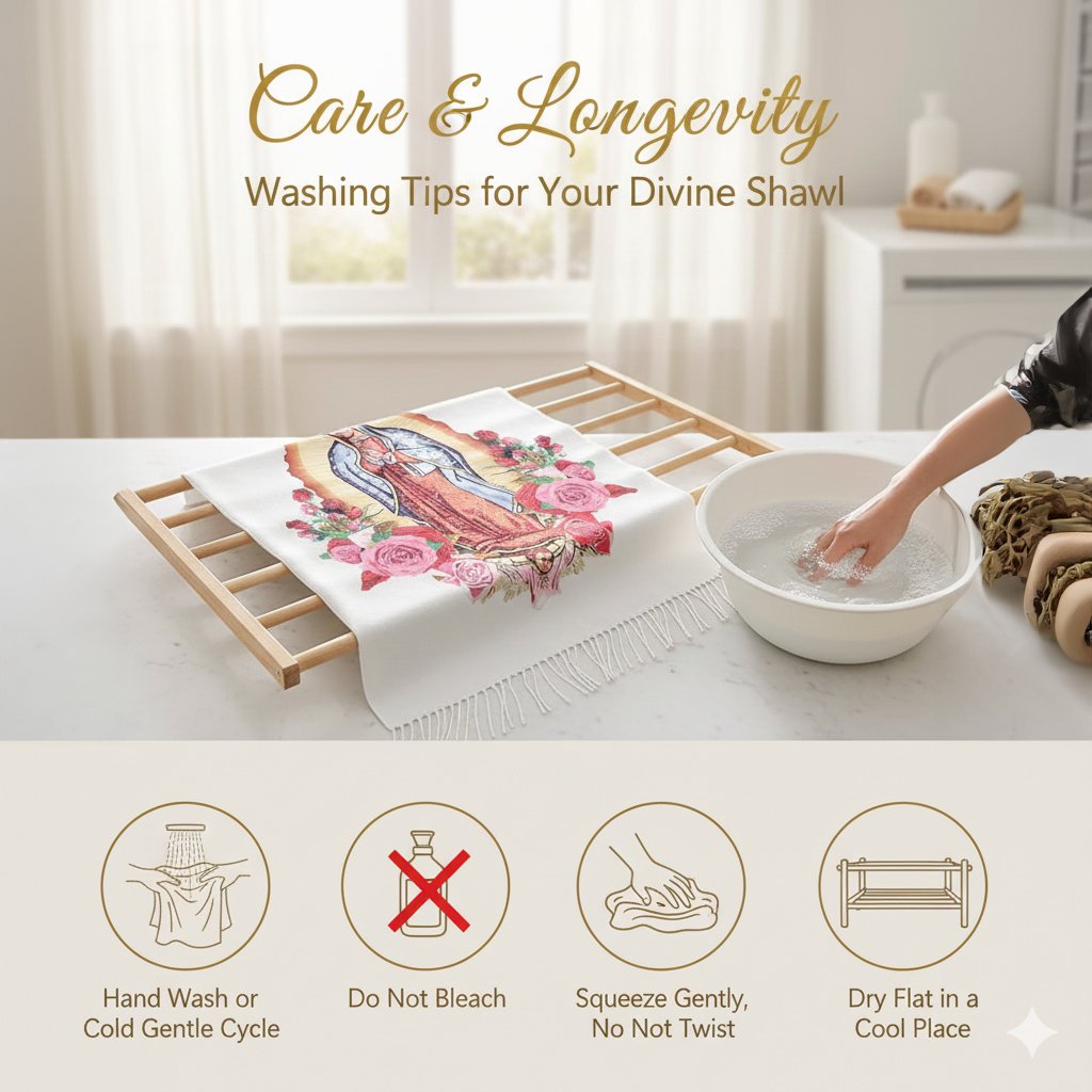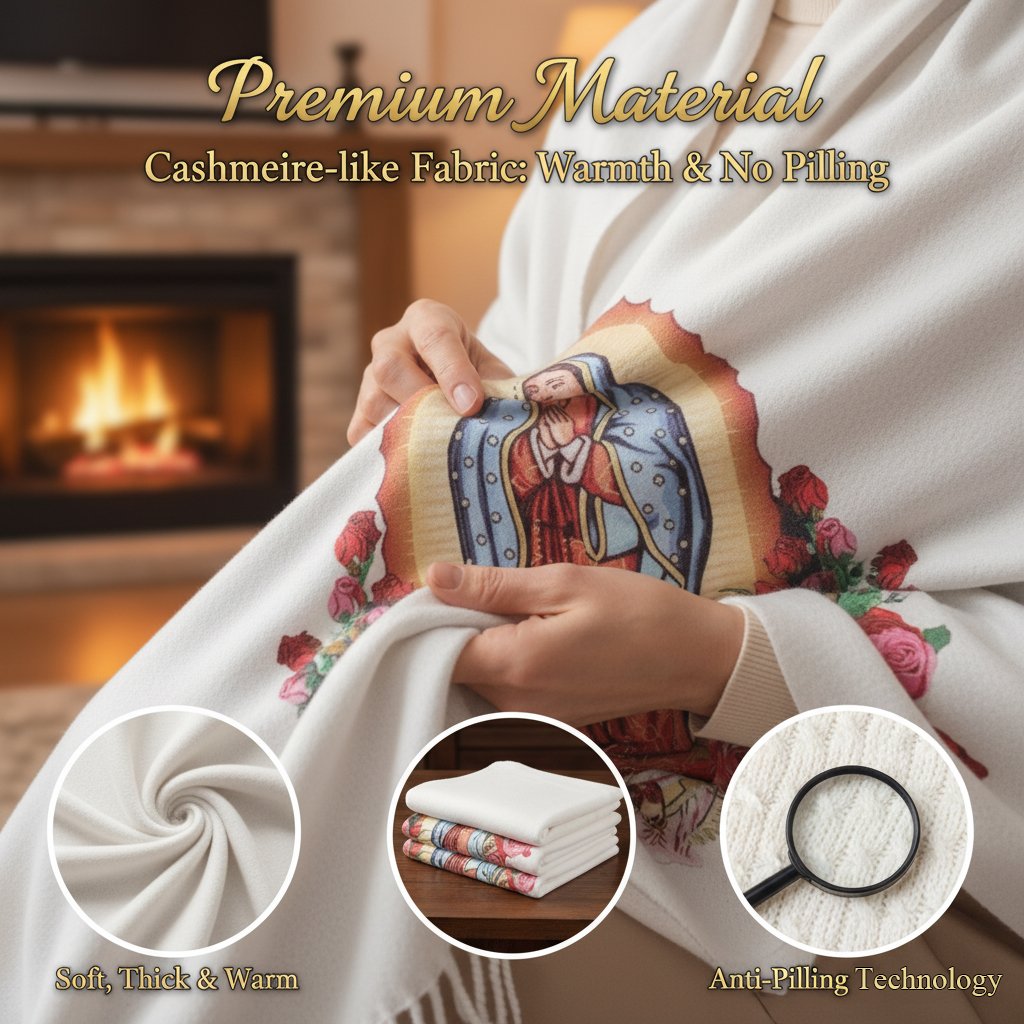 Chaque châle arbore un magnifique motif de la Vierge Marie, symbolisant la paix, l'espoir et la protection divine. Ce n'est pas seulement un accessoire — c'est un rappel quotidien de la foi et de la gratitude en cette saison sainte.
